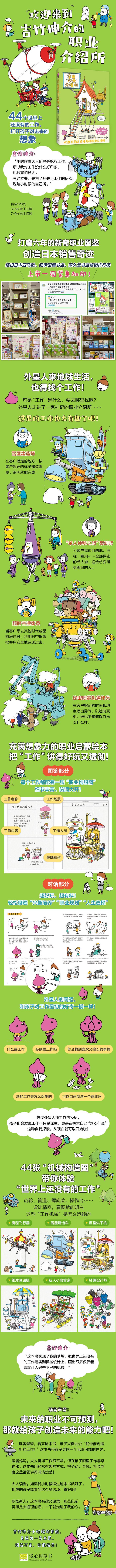 ★繪本界頂流吉竹伸介打磨6年的“新奇職業(yè)圖鑒”,引爆日本銷售奇跡! ★長(zhǎng)大以后做什么?44個(gè)世界上還沒有的工作,打開孩子對(duì)未來的想象! ★書里提到的工作,現(xiàn)實(shí)中都沒有!每個(gè)都讓人眼前一亮,帶你跳脫框架、大開腦洞! ★從外星人的視角出發(fā),把“為什么要工作”講得好玩又透徹! ★吉竹伸介精心繪制44張工作設(shè)定圖,帶你沉浸式體驗(yàn)“世界上還沒有的工作”! ★給焦慮的父母減壓:人生沒有百分·百正確的選擇,每一次選擇都能更靠近自己的熱愛。