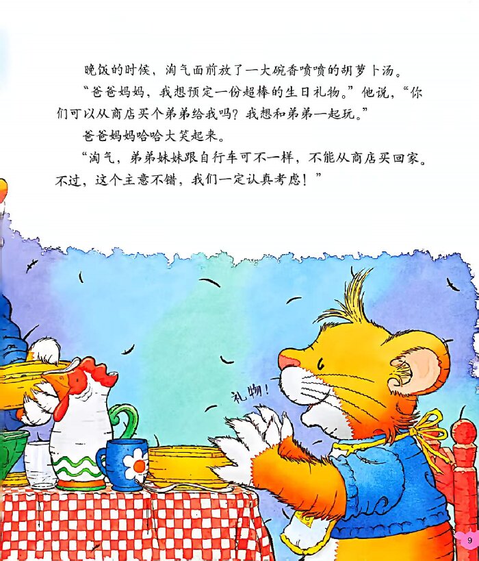 小鼠淘氣長大了,他開始變得不太聽話,什么事情都特別有主見,無論爸爸媽媽說什么,都喜歡回答“不,我不要”。無論是家庭生活,還是幼兒園生活,他開始出現(xiàn)任性、執(zhí)拗、魯莽、愛逞強(qiáng)、拖拉磨蹭等自我為中心的言行。 這兩天,小鼠淘氣有些異于平常的行為,他好像學(xué)會說謊了。媽媽發(fā)現(xiàn)之后,嚴(yán)肅地批評了他,告訴他,愛說謊的人得不到別人的信任。果然,這天太爺爺?shù)牡裣癖凰牧?,媽媽問是不是淘氣干的,淘氣哭著說不是,可爸爸媽媽一點(diǎn)兒也不信他的話……直到鄰居小伙伴喬迪來認(rèn)錯,才真相大白。 22個有趣、令人感動而富有教育意義的故事,聚焦在“小鼠淘氣”的日常生活與行為上,讓小讀者看到,小鼠淘氣和所有的孩子一樣,具有強(qiáng)烈的好奇心,活潑、可愛、善良、勇敢、聰明、熱情。但有些時候,他也會惹點(diǎn)小麻煩,撒個小謊,發(fā)發(fā)脾氣……作者將小鼠淘氣塑造成一個孩子們能夠深切認(rèn)同的角色,讓孩子們跟著他一起體驗(yàn)生活、察覺自我、探索感覺與情緒,通過故事找到自己的影子。